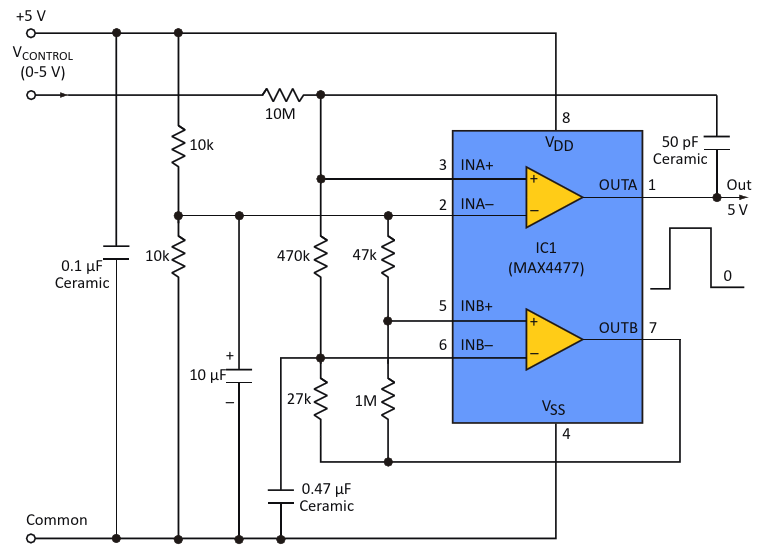 Figure 1. This circuit converts a 0- to 5-V dc control signal to a 500-Hz PWM signal that is able to drive LEDs