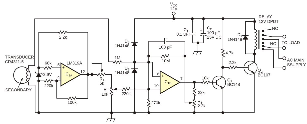 Figure 2. The residual-current circuit breaker uses a transducer to monitor the supply current and a relay to disconnect the mains from the load