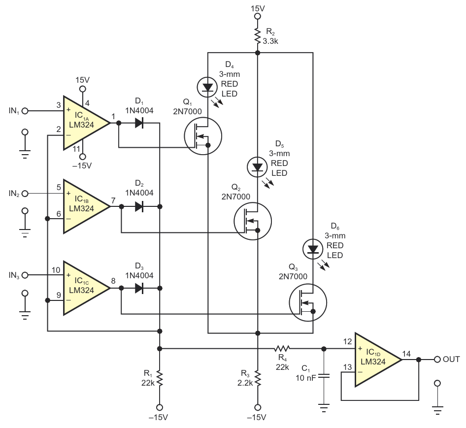 Figure 1. This circuit's output voltage tracks and indicates the highest of three input voltages and can drive an external strip-chart recorder or alarm comparator