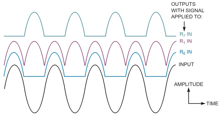 This waveform plot shows the circuit's outputs for a sine-wave input connected to the negative, full, and positive inputs, respectively. Traces are vertically offset for clarity