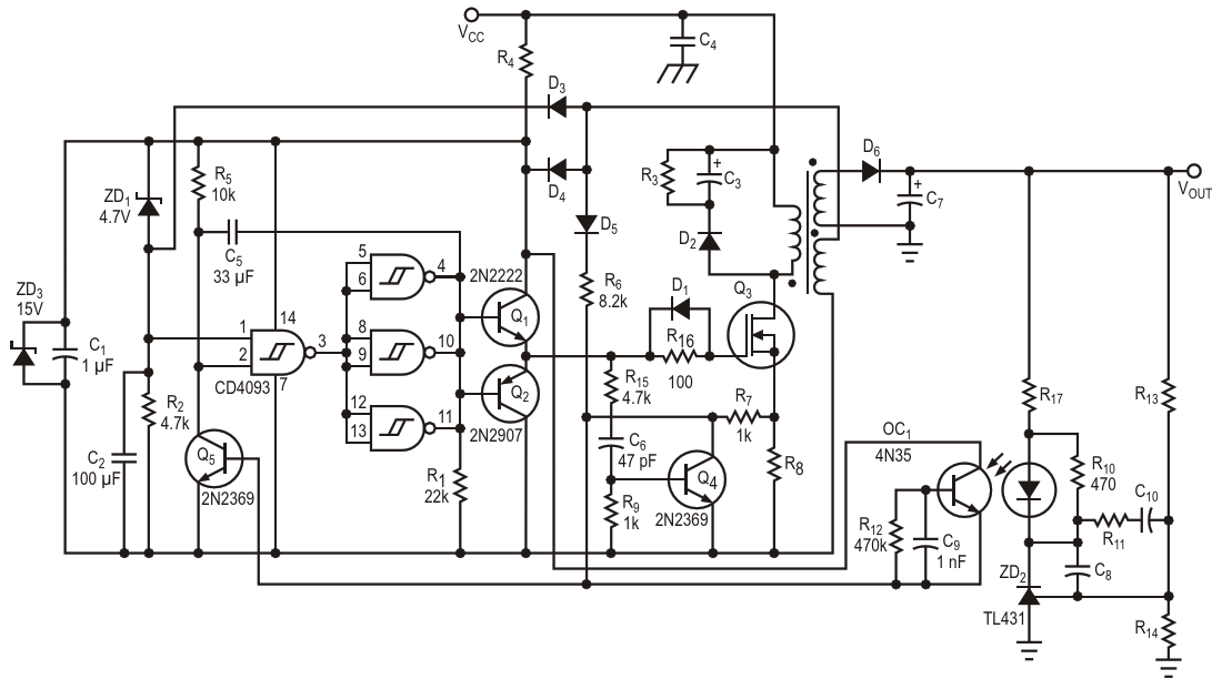 Using a simple CMOS IC, this flyback power-supply circuit exhibits extremely low noise