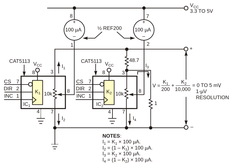 Digitally programmed potentiometers combine to form a novel, microvolt-level DAC