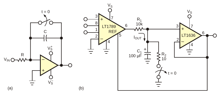 The classic integrator in (a) inverts and requires split supplies. The circuit in (b) is noninverting and works with a single supply