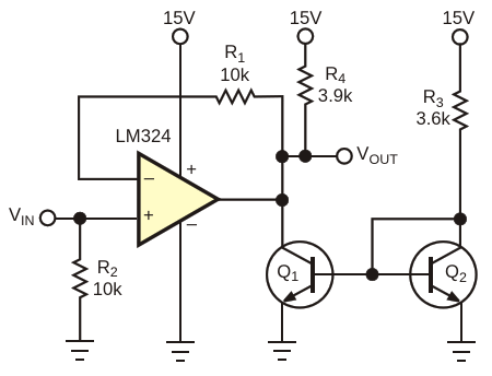Figure 1. An external current source can bring the usable output level of an LM324 down to the millivolt level