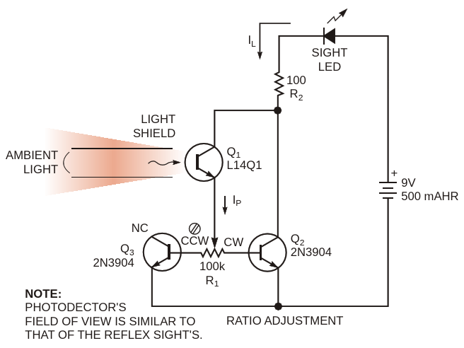 This simple circuit automatically adjusts red-dot intensity in reflex optical sights