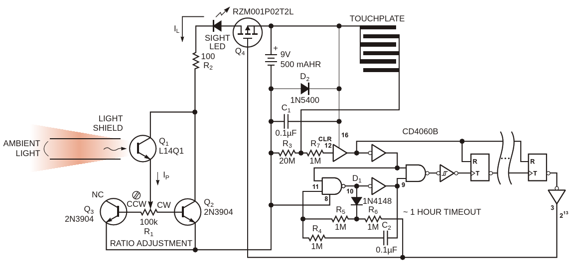 Figure 1. This improved design has a CMOS power-off timer that disconnects the battery after an hour of inactivity