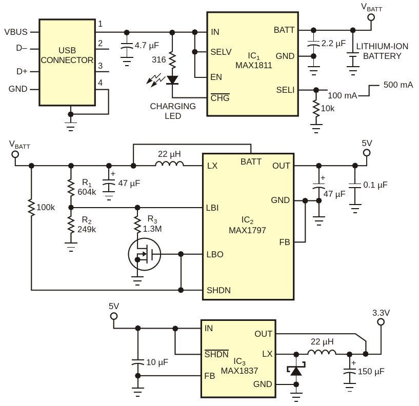 Drawing power from a USB port, this circuit generates 5 and 3.3 V supply voltages for portable applications