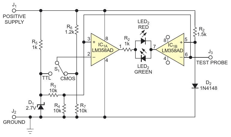 Low-component-count logic probe works with TTL and CMOS logic