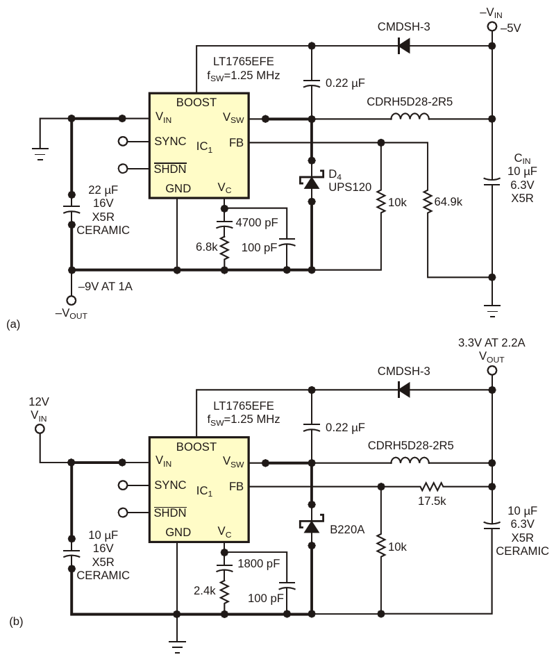 Figure 1. The LT1765EFE positive buck converter can make a negative boost converter (a) or a positive buck converter (b)