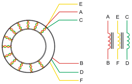 Figure 2. Transformer T1 from Figure 1 consists of three windings on a toroidal ferrite core. For ease of assembly, twist three wires of different colors in a bundle to form the windings