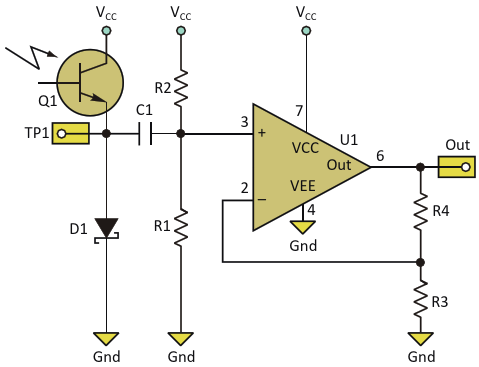 The voltage across a PN junction has a logarithmic relationship to the current through it, allowing this optical sensor circuit to mimic the human eye's sensitivity to changes in light level over a wide range of ambient levels