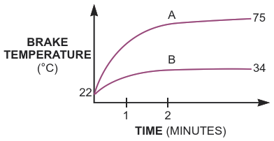 Figure 1. Under continuous operation with 24 V applied, the brake's temperature stabilizes at 75 °C, or 53 °C above ambient temperature (Curve A). Applying a 24 V actuation pulse for a few seconds and then applying a 12 V holding voltage stabilizes the brak