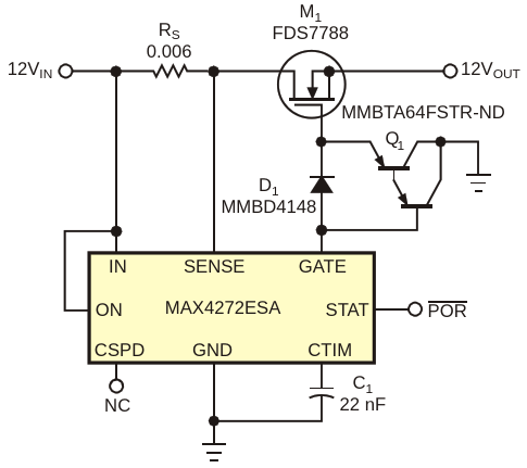 Figure 1. A typical hot-swap controller circuit exhibits a 30-µsec short-circuit current pulse of 400 A peak