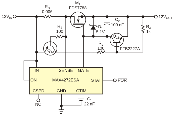 Figure 1. A typical hot-swap controller circuit exhibits a 30-µsec short-circuit current pulse of 400 A peak