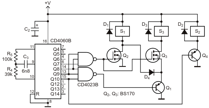 Figure 2. To control the switches in the circuit of Figure 1, a timer activates relay drivers
