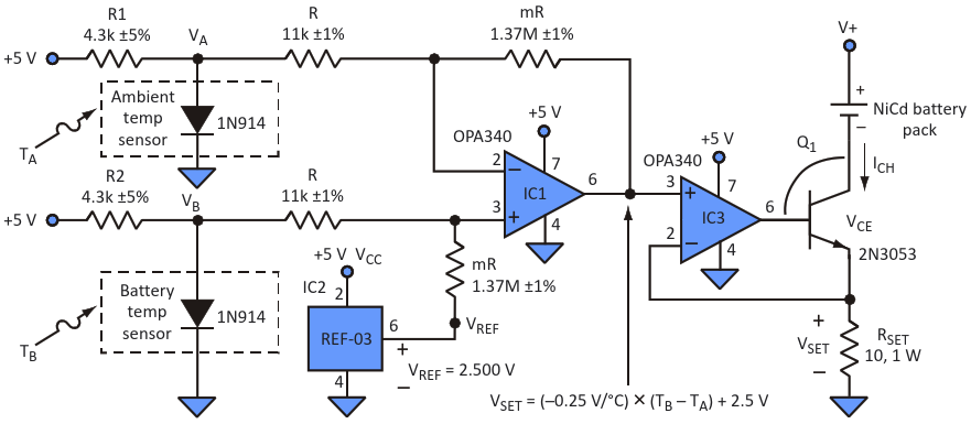 Figure 2. The voltage outputs of the temperature-sensing diodes are applied to a standard difference amplifier, which in turn outputs the difference voltage that will vary from -20 V to 0 V as the difference temperature rises from 0°C to 10 °C