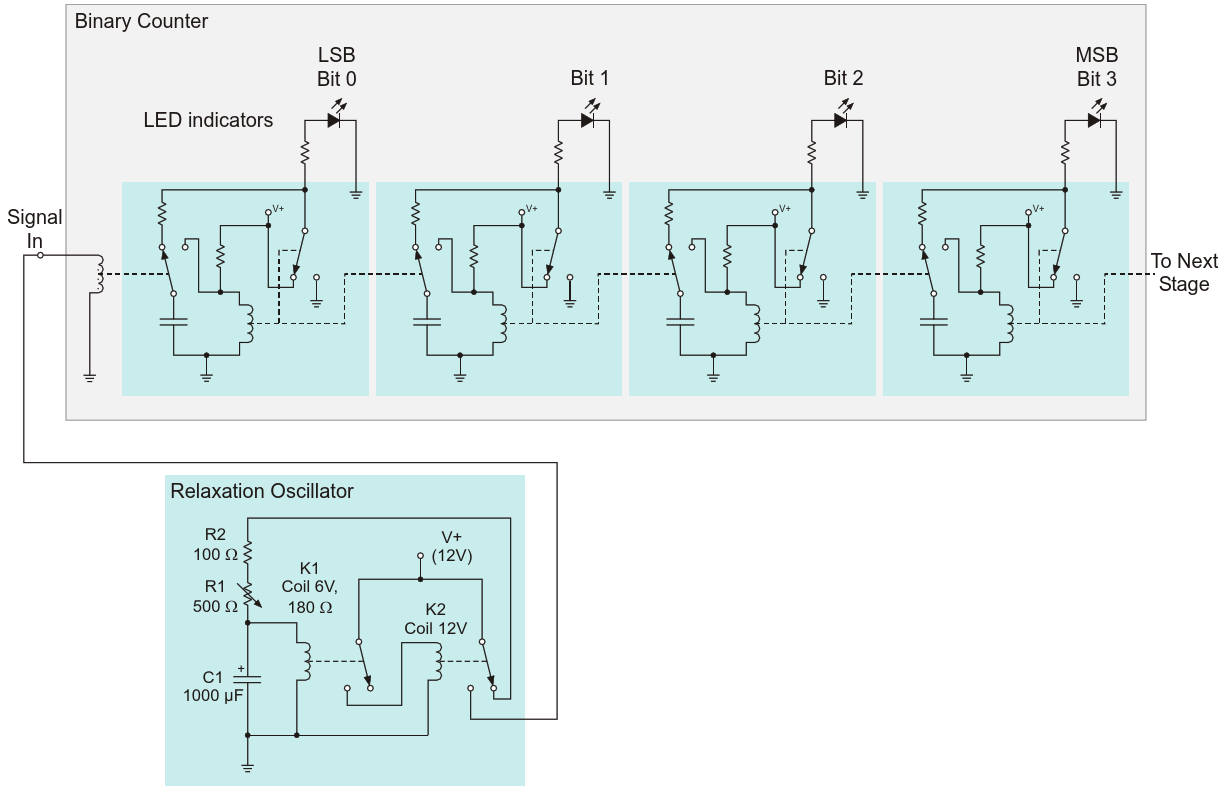 Figure 2. A four-bit binary counter, driven by a variable-frequency relaxation oscillator