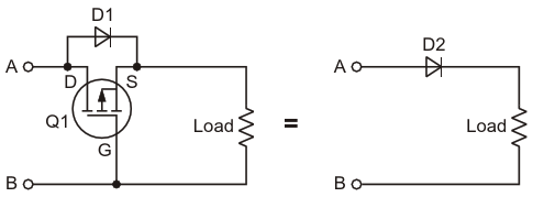 Figure 1. This circuit protects the load against a reversed battery using a P-channel MOSFET