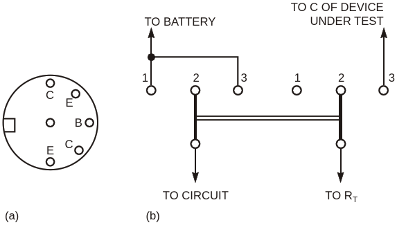 Figure 2. A DIN connector (a) allows you to easily connect transistors; a DPDT switch provides various testing options (b)