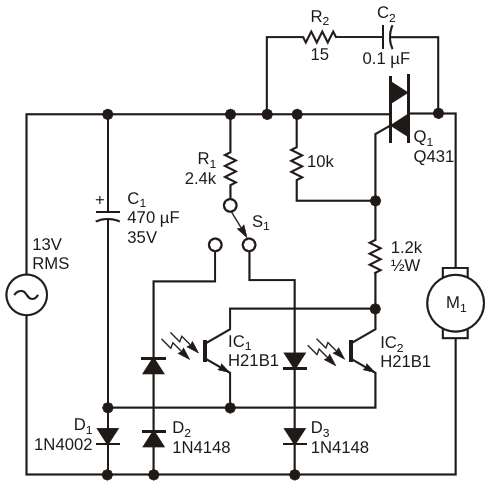 The optocouplers provide both position-control logic and triac gate drive to the motor