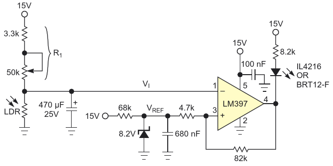 The circuit uses a light-dependent resistor to measure the ambient-light level