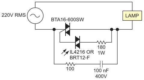 The comparator drives a Vishay IL4216 or BRT12-F optocoupler with a TRIAC output