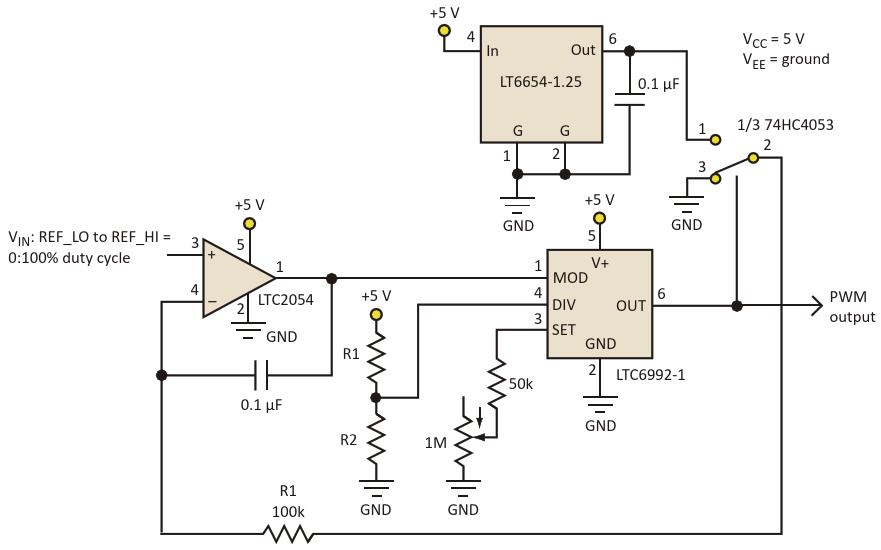 Figure 1. This basic linearized PWM generator, without an external feedback mechanism, can still provide accuracy of 0.1%