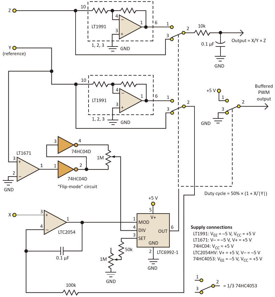 Figure 2. This enhancement to the circuit of Figure 1 extends the analog multiplication/division to all four analog signal quadrants