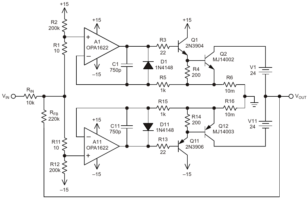 Schematic of high output voltage swing current booster. Higher swing is provided by using floating power supplies and taking the output from the collectors of the output transistors. Note global feedback in order to close the loop around the output stage