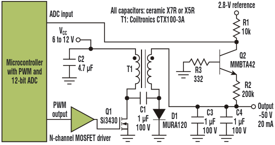 Normally idle microcontroller pins simplify implementing this -50-V power supply by closing the loop on an inverting SEPIC design. A simple voltage translator ensures the positive polarity of feedback for the processor chip
