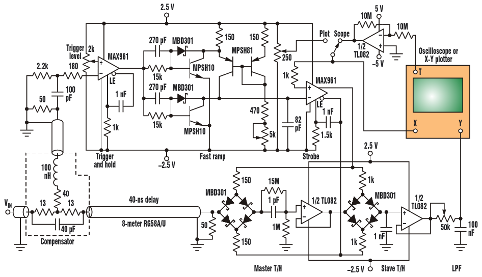 Figure 1. In this sampling oscilloscope plug-in, the time base (T) or adjustable voltage (X) interferes with the triggered fast ramp at strobe to repeatedly toggle the tandem master/slave track-and-hold, acquiring samples at input Y for display of VIN