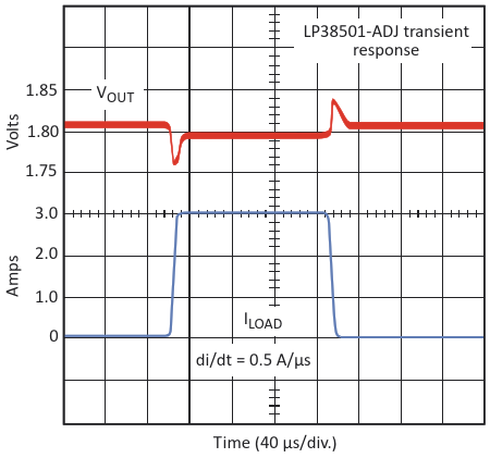 Figure 2. Test results for a voltage regulator with a fast transient response showed only small transients on the output voltage with fast changes to the load current
