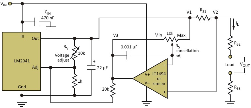 This variation of the circuit provides negative feedback for regulators that use a ground-referred reference voltage, like the LM2941