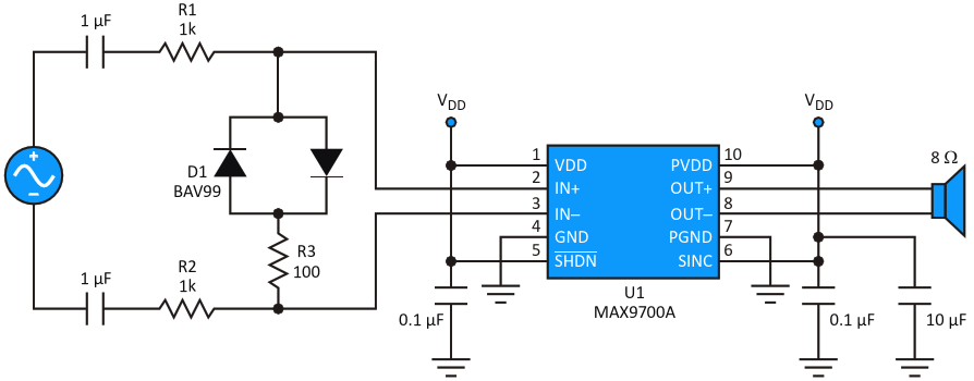 A small-signal diode network prevents clipping by limiting an amplifier's output voltage