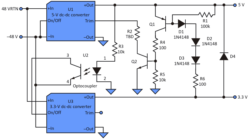 Adding an optocoupler (U2) and a resistor to this power circuit is all that's needed to ensure the proper startup sequence of the 3.3- and 5-V converters