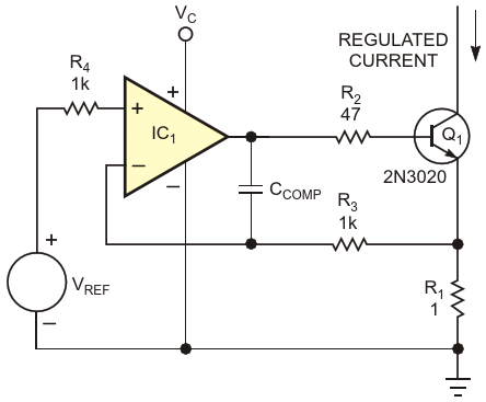 This typical quickly responding constant-current sink uses a bipolar transistor but suffers from base-current-induced error. Its normal output current is IOUT = (VREF/R1) - IB