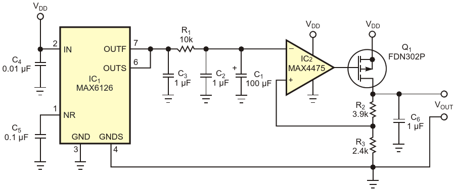 Figure 1. This low-dropout-voltage regulator features a noise floor of only 6 nV/√Hz, making it an ideal power source for low-noise oscillators