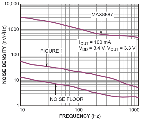 A noise-density-versus-frequency plot for the lowdropout circuit in Figure 1 is 38 dB lower than that of a conventional low-noise, low-dropout-voltage regulator - in this case, a Maxim MAX8887