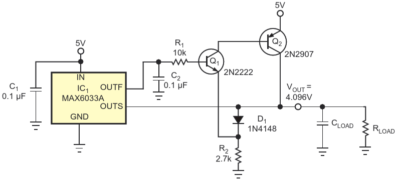Add a two-transistor output buffer to a 4.096 V, 15-mA reference IC to boost its output current to 80 mA or higher