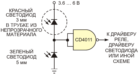 An LED's resistance changes with ambient light, which changes a voltage that drives a logic gate
