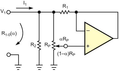 Figure 1. This simple circuit synthesizes a grounded variable resistance with a hyperbolic-control characteristic