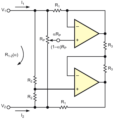 Figure 2. You can realize a floating variable resistance, with hyperbolic taper, with this circuit. Note that fixed resistors with the same number are matched pairs
