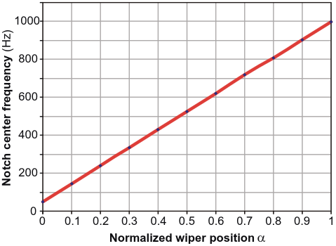 The Spice-simulated notch center frequency for the circuit of Figure 3 versus the normalized wiper position shows that the notch center frequency is a linear function of the control position