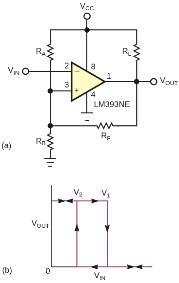 Three resistors determine the trip voltages of an inverting comparator (a) with hysteresis (b), but the trip voltages are not independent