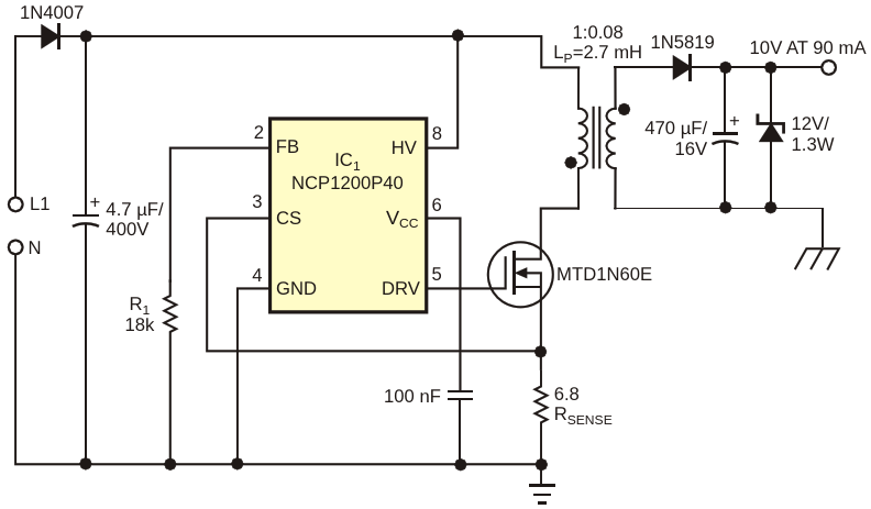 regulates the peak current and allows this 1 W supply to operate from universal mains
