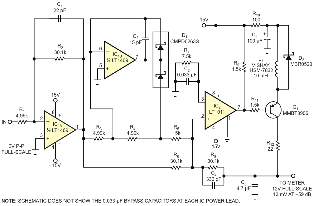 This inductor-compensated voltage-unit meter displays a 60-dB dynamic range
