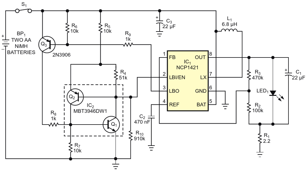 This circuit extends the lives of rechargeable batteries by removing power at a preset voltage and preventing overdischarge