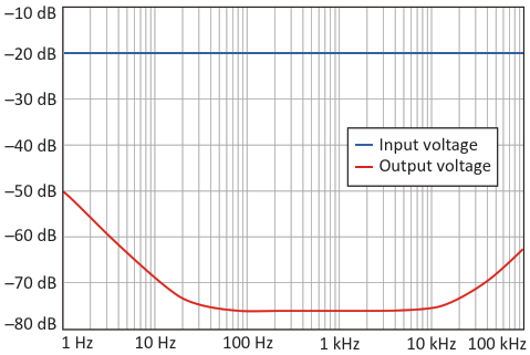 Figure 2. With the transistors shown in Figure 1, the power-supply rejection holds well beyond the audio band