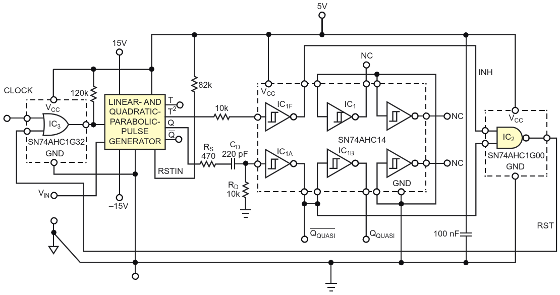 Figure 1. A low-to-high transition at the clock input triggers the monostable. The width of the generated pulse at the complementary Q and /Q outputs is a mathematically defined nonlinear function of the analog input voltage of 0 to 3 V