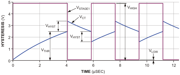 Figure 4. Hysteresis results from a charge burst from Stage 2 that jumps the timing-capacitor voltage past the switching threshold by a known, fixed amount